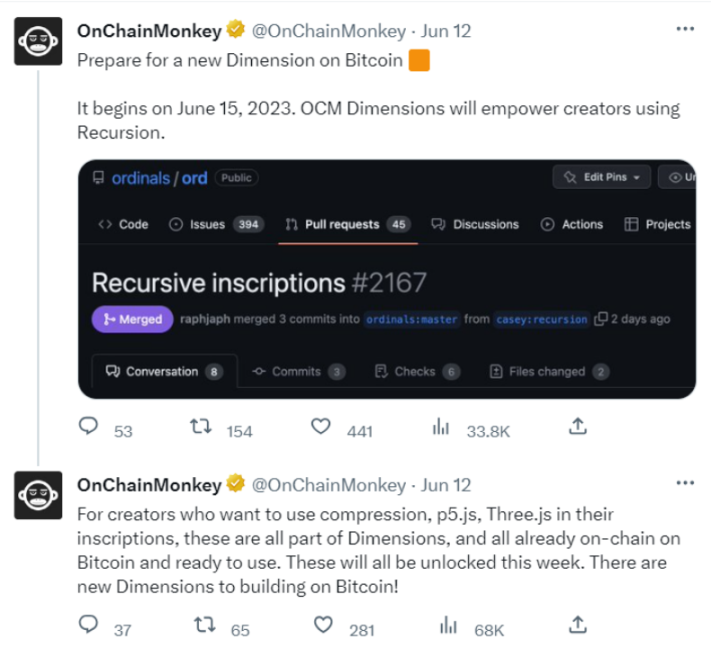 6 月 12 日消息,比特币协议 Ordinals 新任首席维护者 Raph 在 Github 上,将 Ordinals 创建者 Casey Rodarmor 提出的「递归铭文#2167」合并到 Ordinals 的代码中。随后 Ordinals 的匿名开发者之一 Leonidas.og,他在推文中介绍解释了被称为「递归铭文」的相关内容。