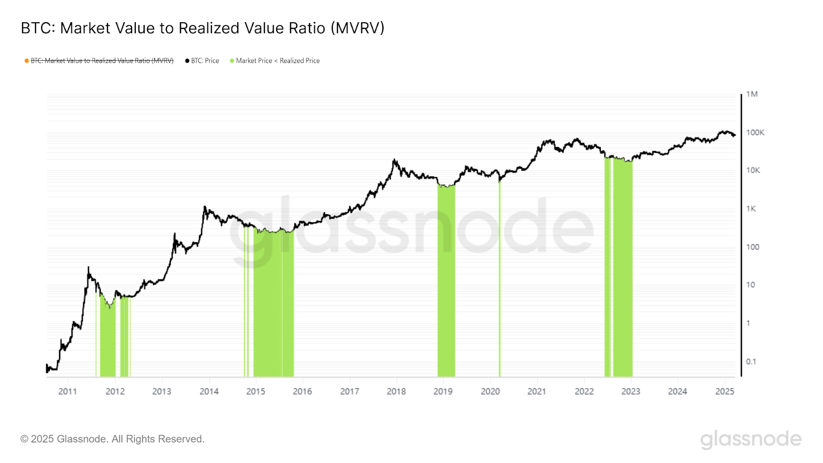 举例来说:若 MVRV = 2,代表市场平均盈利 100%。