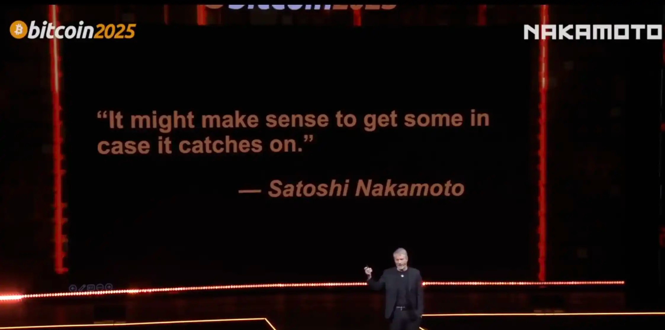 “距离 2009 年比特币诞生已经有 16 年了,两万亿美元证明了它的价值,谁知道又有多少智慧被传递给了世界,我可以在这给你们做这个演讲,但比我伟大得多的中本聪很多年前,在没有任何这些信息、证明、这么多时间的情况下,就说了这 12 个最重要的英语单词:It might make sense to get some in case it catches on。”