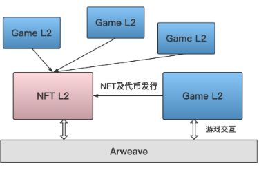 这种模式中每个游戏服务都是一个Arweave的L2层。需要一个专用的NFT L2层作为基础设施,为各个游戏提供NFT发行、代币发行、资产交易等经济功能。