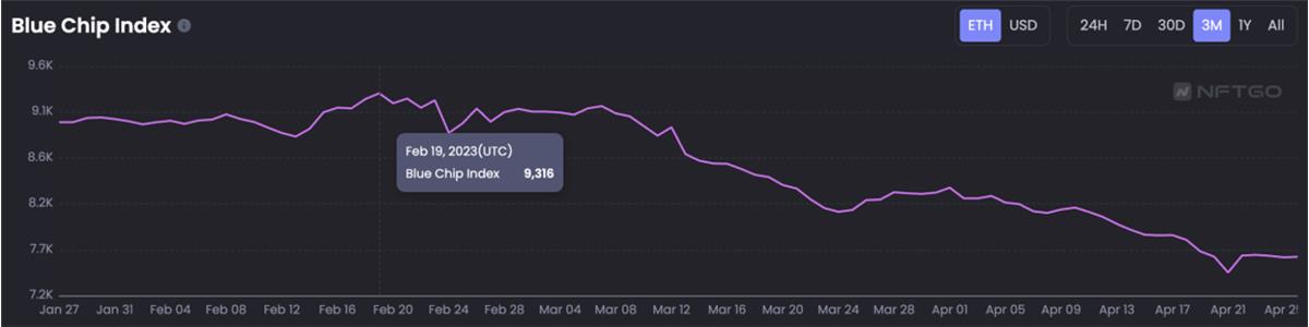 随着 NFT 市场的风光不再,曾经的蓝筹项目也出现了交易额、交易者数量均跌的情况,众多名人因购买 NFT 亏损巨大等新闻也频繁见诸报端。蓝筹指数从 2 月的 9,000 以上,跌至 7,600。