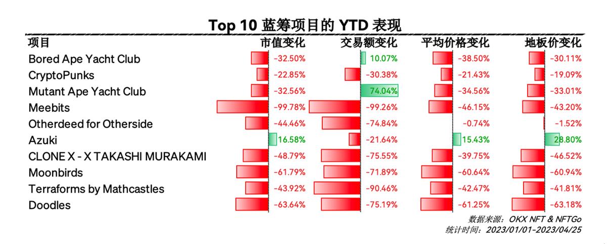 OKX NFT 根据交易额排名前 10 的 NFT 项目,绘制了如下表格。可以看出 Meebits、Doodles、Moonbirds 等多个蓝筹项目市值下滑严重。就交易额而言,Top 10 的蓝筹中仅 BAYC 和MAYC 有所上涨,6 成项目交易额跌超 70%,地板价方面,7 个项目地板价跌超 30%。运营能力强如 Yuga Labs,其旗下项目 BAYC 的地板价也跌至近 5 个月新低。