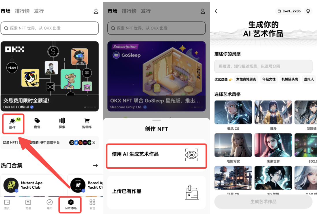 另一方面,由于 ChatGPT 的火爆,使得 AI 驱动的 AI NFT 生成艺术日渐流行。生成式 AI 技术的应用,使得 NFT 创作更加高效、多样化。早于 2022 年圣诞期间便上线的 OKX 圣诞节 AI NFT 创作大赛,可能代表着 NFT 创作部分转向 AI 生成的新趋势。