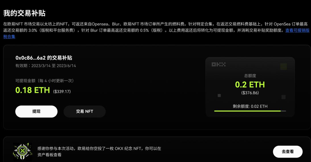 OKX NFT 当前正在进行 NFT 交易补贴活动,在 OKX NFT 市场购买 OKX NFT、Blur (也可获得 Blur 交易激励)以及 OpenSea 的以太坊 NFT,将给予 Gas 费、版税和平台服务费减免(OpenSea 现收取 2.5% 平台服务费),单个地址根据交易量补贴 0.1 -0.2 ETH,目前网页端和 OKX Wallet App 端均已支持。