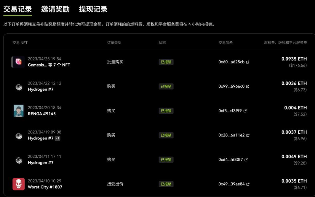 建议批量交易,能节省更多的费用。完成 NFT 交易后,别忘了打开 NFT 交易补贴活动落地页,每 4 个小时会进行一次更新,点击提现。