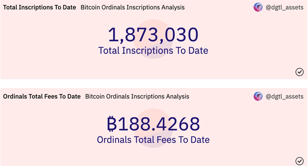 尽管市场遭遇低迷,但比特币主网上的 Ordinal 协议带来的 NFT 热潮不容忽视。数据显示,比特币 Ordinals 累计铸造量已经达到了 187.30 万枚,迄今为止的累计费用收入超过 188 BTC。