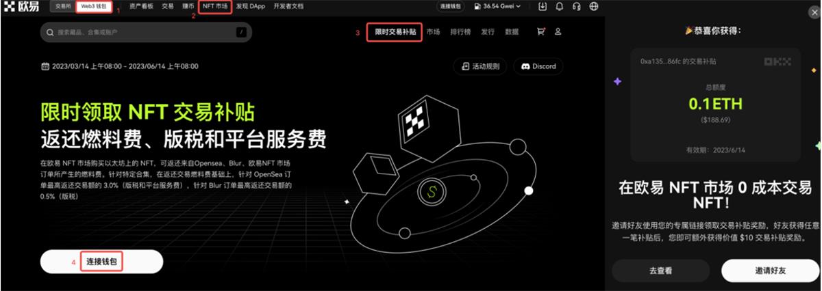 打开 OKX NFT,点击限时交易补贴,连接钱包后,选择领取交易补贴。