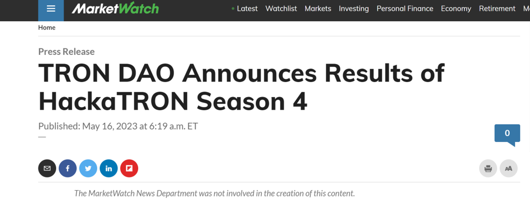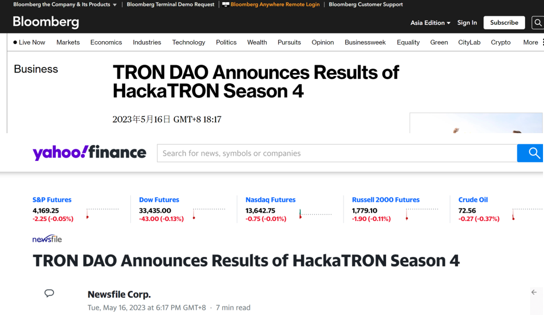 获奖名单一经发布便引发海外权威媒体关注,包含彭博社、雅虎财经、Benzinga、MarketWatch、Decrypt和The block等国际主流财经媒体以及区块链媒体均对相关新闻进行了报道。报道称,本季黑客松大赛人才济济,选手们创新不断,充分展示了波场TRON社区欣欣向荣的发展面貌。