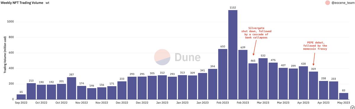 经历了 2022 年漫长的加密寒冬,NFT 赛道在持续低迷一段时间后,终于在 2023 年重获新生。自 1 月份以来,整个 NFT 市场的交易量一直在增长,周交易量一度飙升至 1150 万美元,这是自 Terra 崩盘引发加密货币熊市后从未见过的水平。尽管交易量由于 Silvergate 和 SVB 倒闭以及资金流向 memecoins 的挤压而有所下降,但 NFT 市场表现仍然比去年第四季度要好,前景继续看涨。