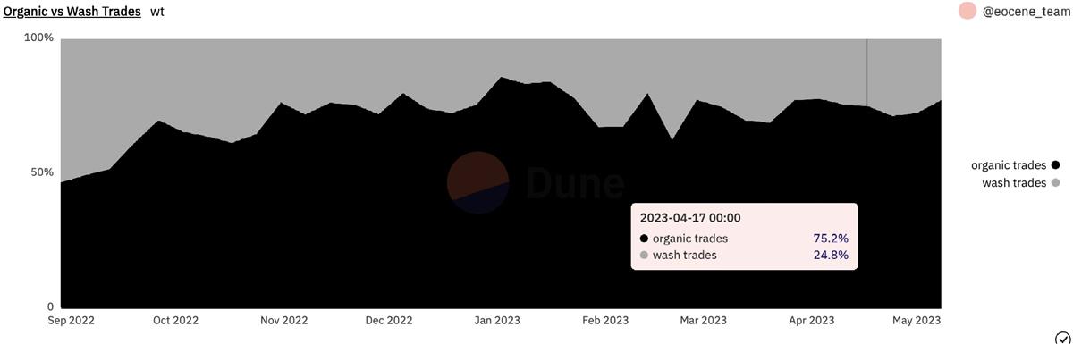 1.自 2023 年 3 月 BLUR 代币推出和奖励季节 3 首次亮相以来,Blur 上的洗盘交易量激增。尽管这也与交易挖矿有关,但 Blur 的奖励机制与X2Y2和 LooksRare 存在显著的差异;Blur 上的洗盘交易更多地是用户冒险行为的“不幸”结果,而非故意行为。有关这种交易是否应被视为洗盘交易的 争论 一直在持续中。在本文中,我们将重点关注故意的洗盘交易,也就是以X2Y2和 LooksRare 占主导的类型。