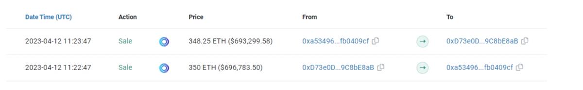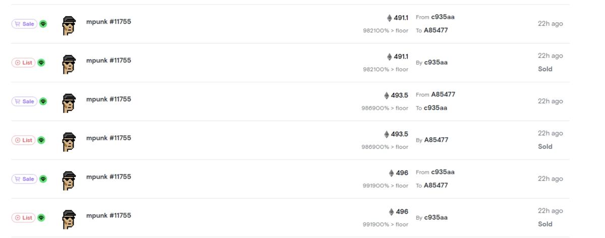 这四对钱包都采用了相同的策略 — — 在两个钱包之间反复交易同一枚 NFT,每次交易的价格都高达几百个 ETH(远高于地板价):