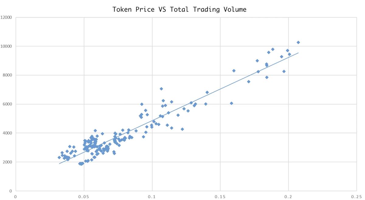 交易量与奖励代币价格之间存在强烈的线性相关性