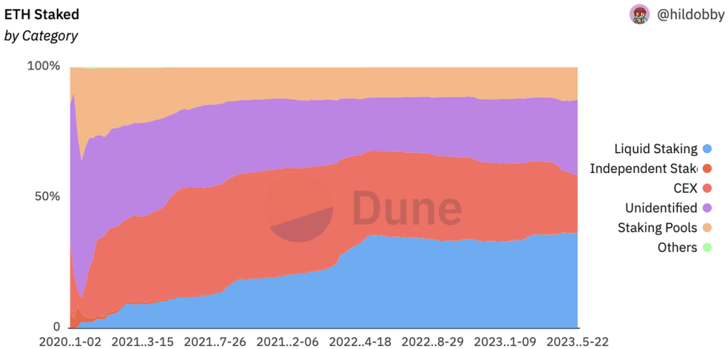 在Shapella成功上线之后,CEX的质押份额出现了明显的下降,相当部分原本在cex质押ETH的用户开始转往liquid staking以及solo staking(Unidentified)。