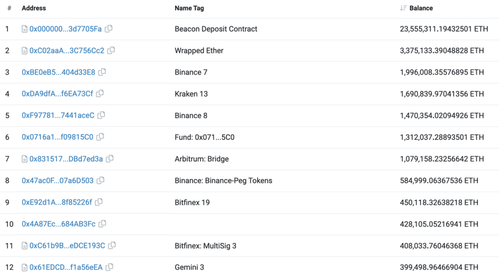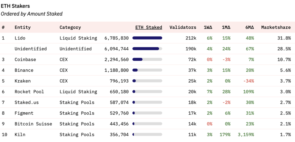 按照具体的质押实体来看,目前Lido占据31.8%的总质押市场份额,排名第3至第5的是3个中心化交易所,排名第6的是另一个liquid staking服务商Rocket Pool,而排名7-10的都是Staking pools。