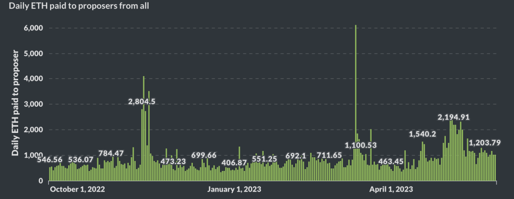 我们可以看出,在Merge之后,共识层APR随着质押总量的提高在缓慢下降,而执行层的APR变动比较大,平均在1.5%左右,使得质押的收益可以达到5%。而当链上活动频繁时(比如5月的meme season)来自执行层的APR甚至会超过共识层的APR,使得质押以太坊的收益率接近10%。Staking收益作为以太坊网络的“无风险收益率”(参见Mint Clips|加密世界的原生基准利率该如何定义? ),对于ETH持有人的吸引力是巨大的。