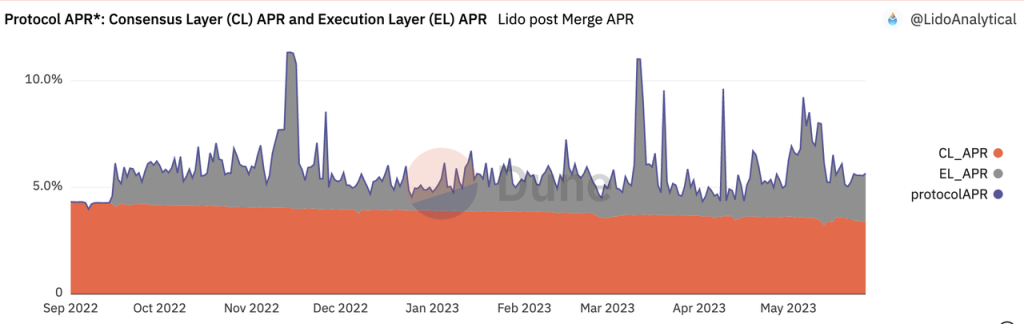 来源:https://dune.com/LidoAnalytical/lido-execution-layer-rewards 其中,CL_APR代表共识层的收益;EL_APR代表执行层收益