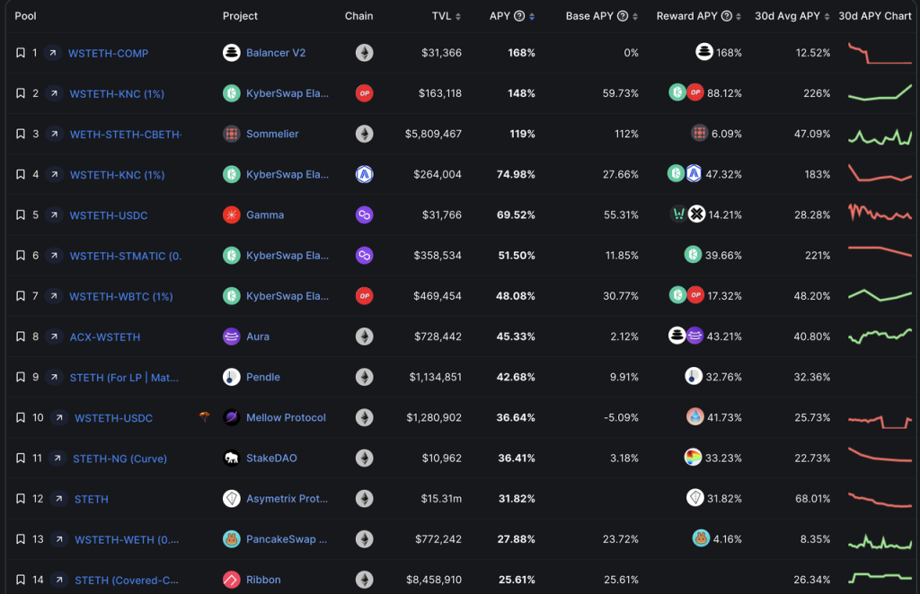 我们可以看到,目前stETH LP可以比较容易的获得50%以上的APR,考虑到配对资产的资金占用,总的APR也可以超过25%;而stETH单币在Asymetrix(LSD的pool together)和Ribbon(期权协议)也可以获得25%以上的APR(尽管可能面对一些风险),在叠加stETH本身5.6%的APR,会使得用户通过lido进行质押的总收益达到30%。