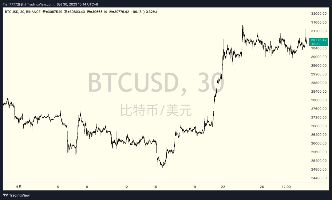 用“大起大落”这个词来形容今年6月以来BTC的走势一点都不为过,准确来说应该是先大落后大起。BTC价格首先在六月初受币安被起诉黑天鹅事件叠加美债抽取流动性等负面因素影响,BTC一度跌至最低24800。