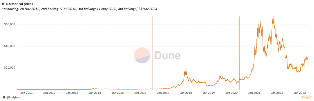 距离第四次比特币减半还剩不到300天,回顾比特币减半的历史,似乎每一次减半都伴随着比特币价格的攀升: